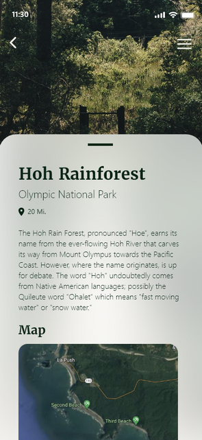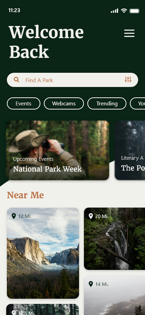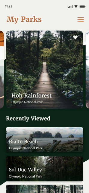 With over 400 sprawling parks located around the US, it's no surprise that the National Parks service sees around 315 million recreational visits per year. With so many visitors, there’s a high demand for information even before people step foot in the park. To meet this demand, the National Parks service released an app to help their guests navigate their park experiences, however, with so much information it can be hard to not get lost in the app. For this project, I redesigned several screens from the original app to try and create a more streamlined and intuitive layout for the app.